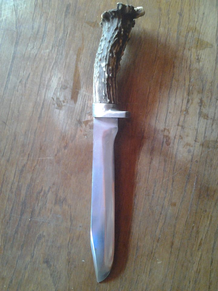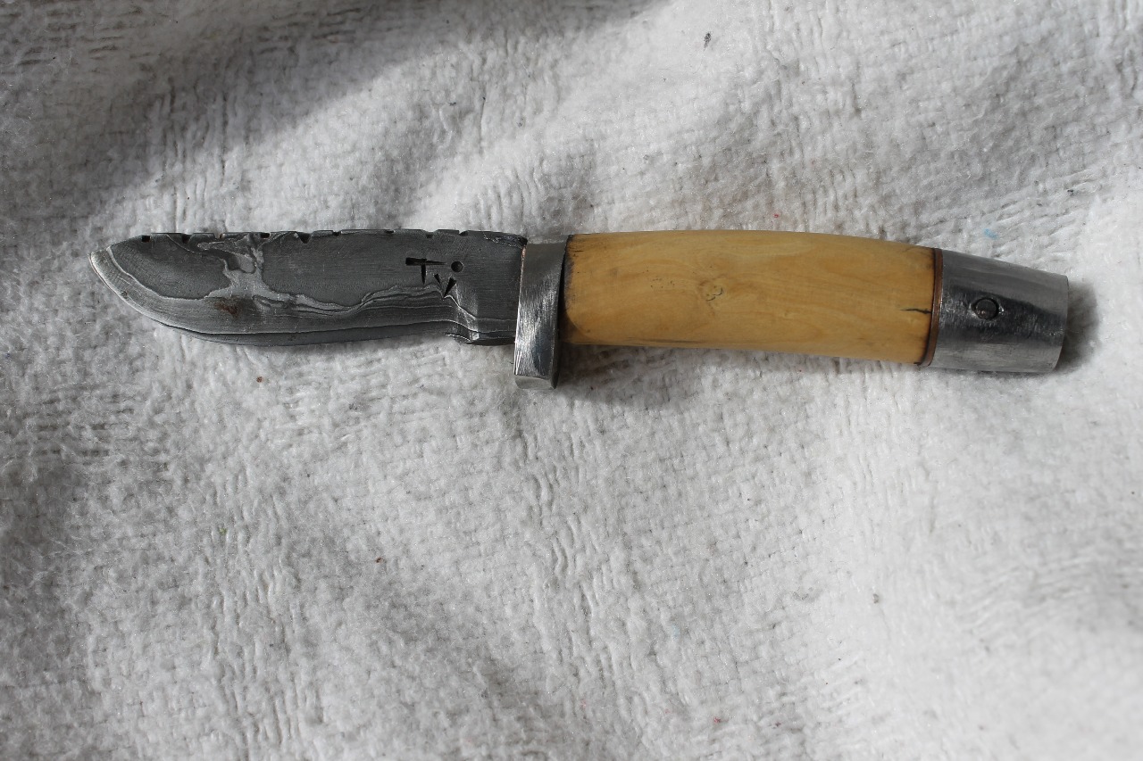 Manche en buis d'Ardèche, garde inox (arbre d'hélice de bateau), pommeau en vieux fer (trouvé dans un mur de Haute-Ardèche), cuivre