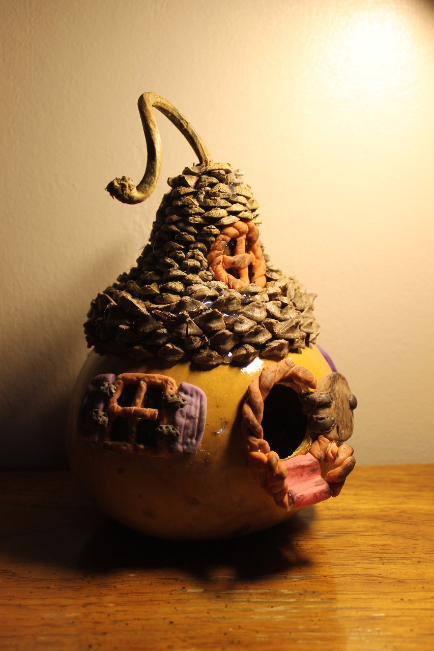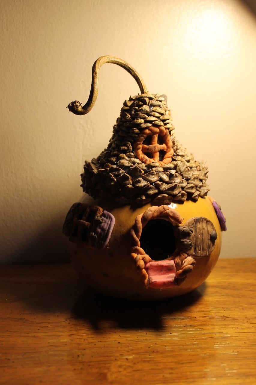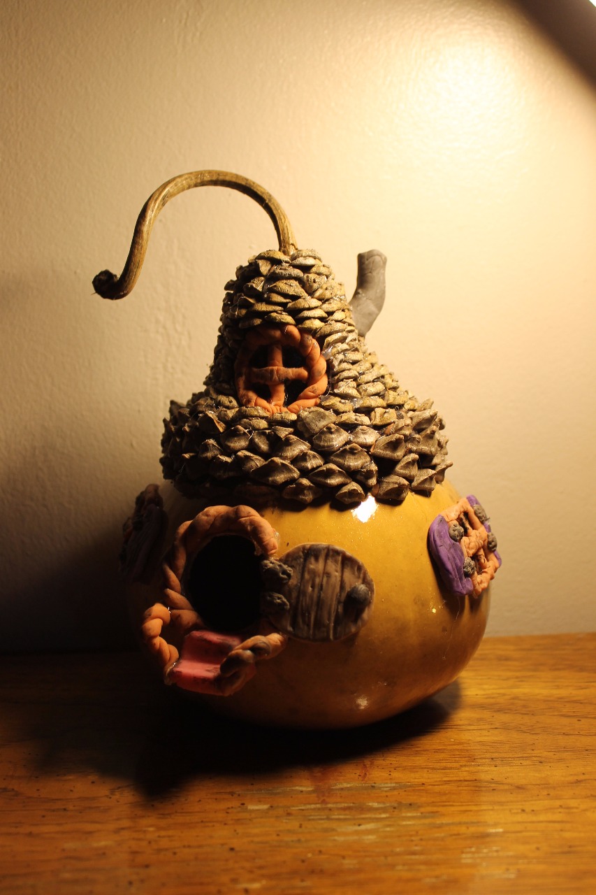 Mes jeunes créateurs en herbes vont cette semaine réaliser des nichoirs à oiseaux dans des courges séchées. Pour le modèle ci-joint j'ai utilisé de la porcelaine froide, faite maison à partir dun mélange de colle, d'huile de colza, de vinagre blanc et de fécule de maïs. Pour créer les différentes couleurs je rajoute à la pâte obtenue de la peinture acrylique. Le toit a été créé avec des pommes de pin. Il ne me reste dorénavant plus qu'à le vernir!