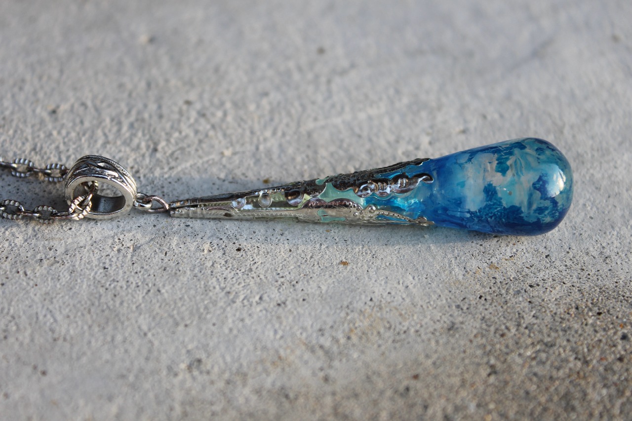 Le second est un pendentif larme, produit d’un nouveau moule, en craquelé bleu.
