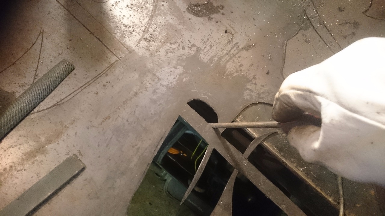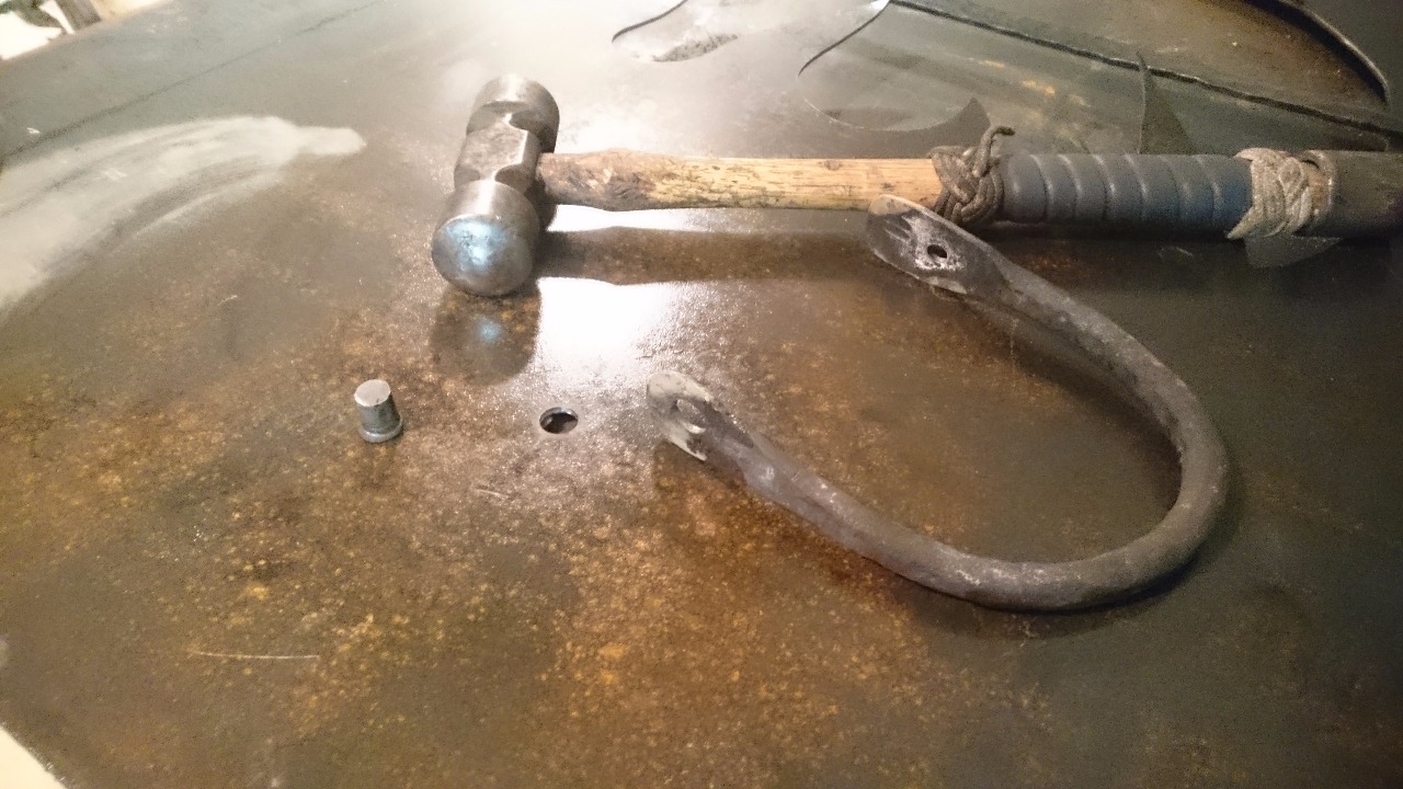 Maintenant il me reste à mettre des attaches permettant de l'accrocher au mur de la boulangerie. Pour ça j'ai prévu de faire des arceaux en fer forgé qui seront rivetés à l'ancienne (comme la Tour Eiffel)